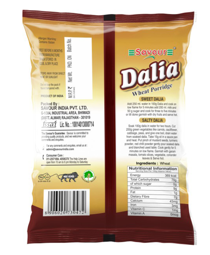 PouchSavour's Dalia is made with 100 percent broken wheat. It is a rich source of Vitamin B and has significant amount of dietary fiber which is good for the gut.